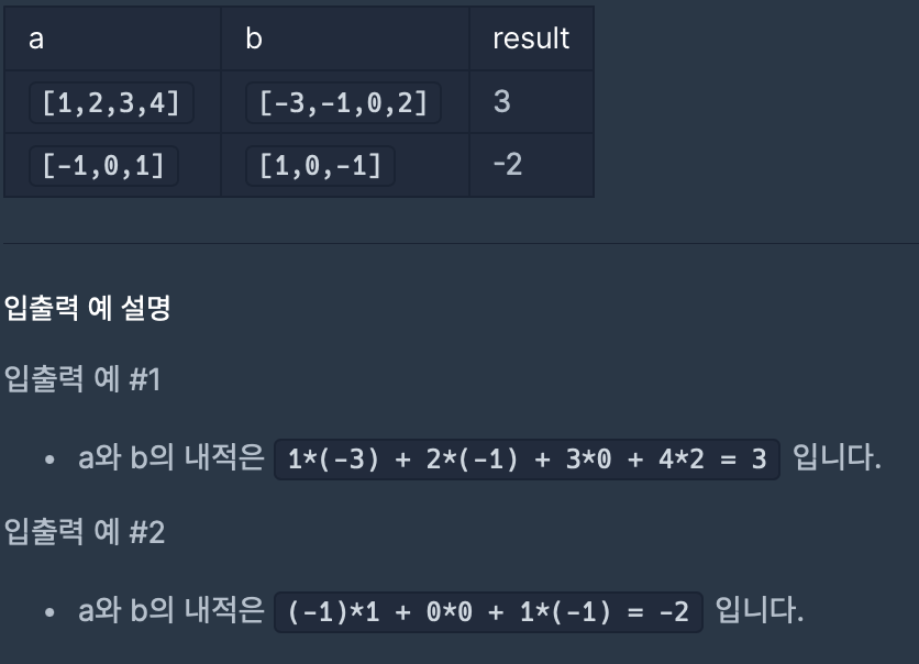 이때, a와 b의 내적은 a[0]*b[0] + a[1]*b[1] + ... + a[n-1]*b[n-1] 입니다. (n은 a, b의 길이)