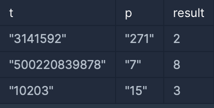 - t와 p는 숫자로만 이루어진 문자열이며, 0으로 시작하지 않습니다.