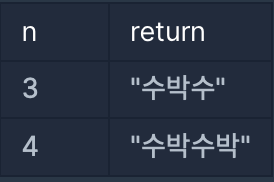 길이가 n이고, "수박수박수박수...."와 같은 패턴을 유지하는 문자열을 리턴하는 함수, solution을 완성하세요. 예를들어 n이 4이면 "수박수박"을 리턴하고 3이라면 "수박수"를 리턴하면 됩니다.